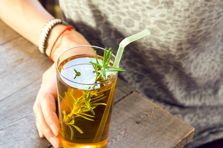 女性 女の子 の木製の背景にローズマリーとガラスのきのこ茶紅茶スーパー食品プロ生物飲料を飲む スペース 女性の手で自家製健康有機発酵プロバイオティクス飲料をコピー の写真素材 画像素材 Image